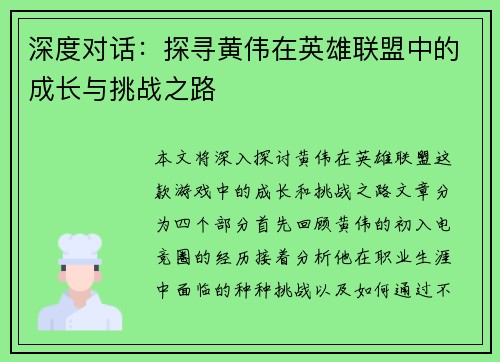 本文将深入探讨黄伟在《英雄联盟》这款游戏中的成长和挑战之路。文章分为四个部分,首先回顾黄伟的初入电竞圈的经历,接着分析他在职业生涯中面临的种种挑战,以及如何通过不断努力实现自我突破。第三部分将聚焦于黄伟在比赛中的表现与战术思考,最后探讨他对未来的展望以及对新一代玩家的寄语。通过这些方面的分析,我们不仅能够更加全面地理解黄伟这位电竞选手,也能领略到其中蕴含的人生哲理。